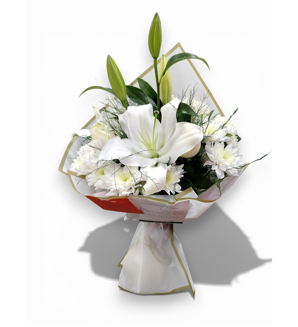 Beyaz Mevsim Çiçekleri: Lilyumların zarafetini tamamlayan, bukete hacim ve yumuşaklık katan taze beyaz krizantemler ve dolgu çiçekleri.