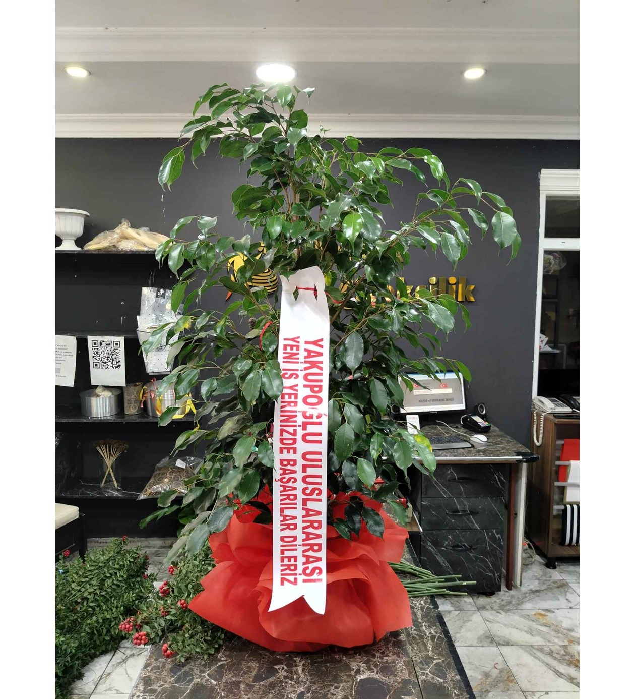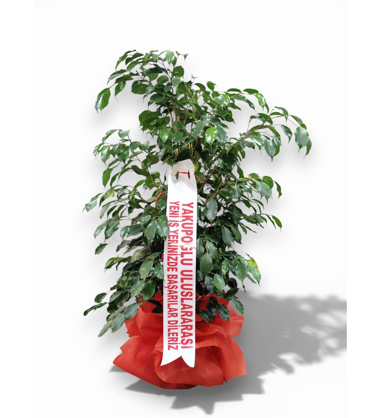 Ofislerin ve geniş salonların en vazgeçilmez bitkisi olan Benjamin (Ficus), yoğun yeşil yaprak yapısıyla bulunduğu ortama anında canlılık katar. Kırmızı lüks ambalajı ve "Yeni İş Yerinizde Başarılar Dileriz" yazılı tebrik kuşağı ile profesyonel bir hediye arayanlar için idealdir.