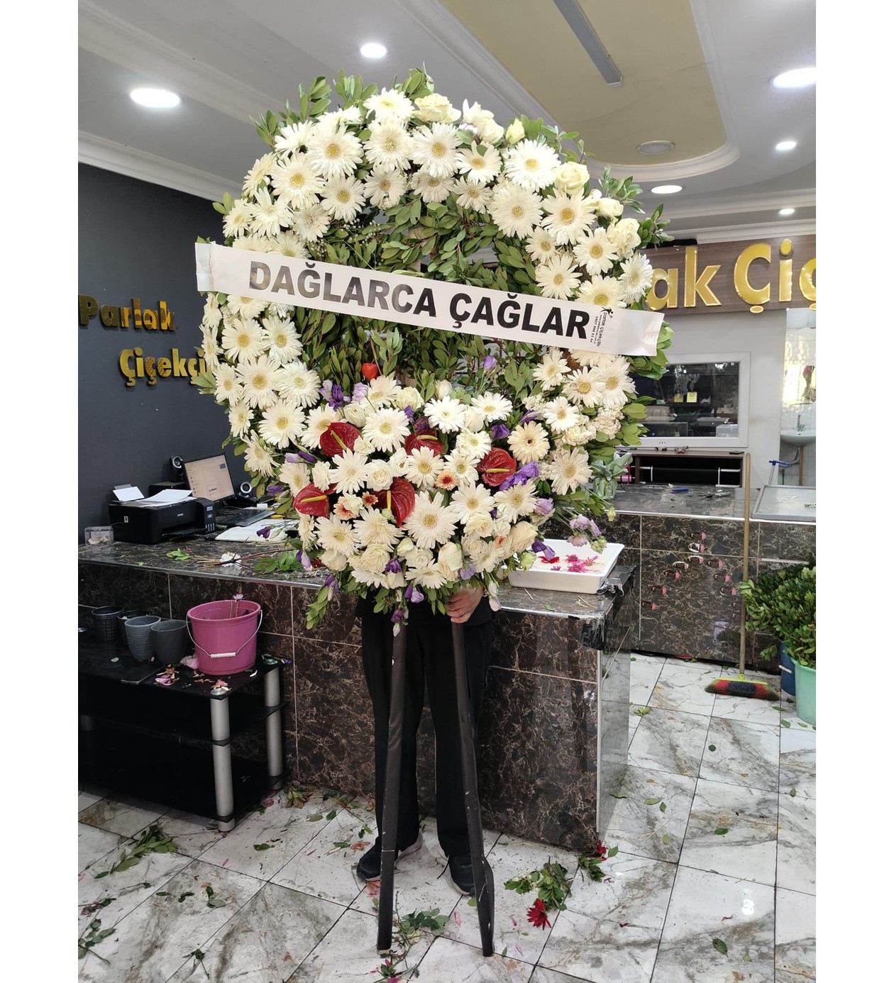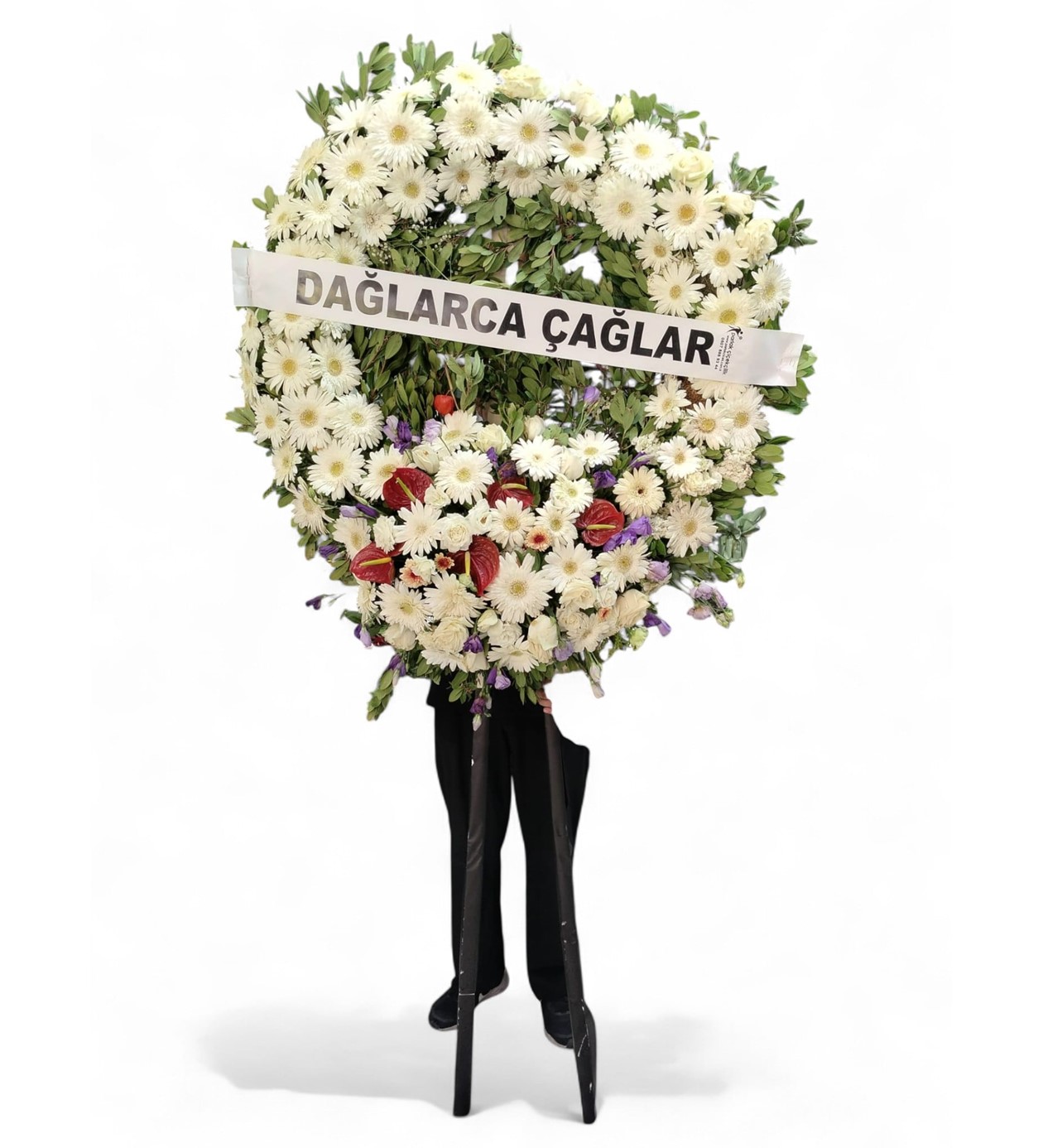 Kırmızı Ana Dolgu: Çelenğin büyük bir bölümünde yoğun kırmızı gerberalar (veya krizantem) kullanılarak derin üzüntü ve ebedi sevgi duyguları güçlü bir şekilde ifade edilir.
