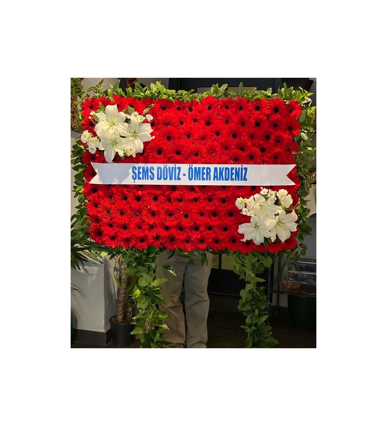 Çiçek Türleri: Ana gövdeyi ithal yapay kırmızı gerberalar oluşturmaktadır. Köşelerde (sol üst ve sağ alt) büyük beyaz zambak (lilyum) veya benzeri beyaz çiçek demetleri ile süslenmiştir.