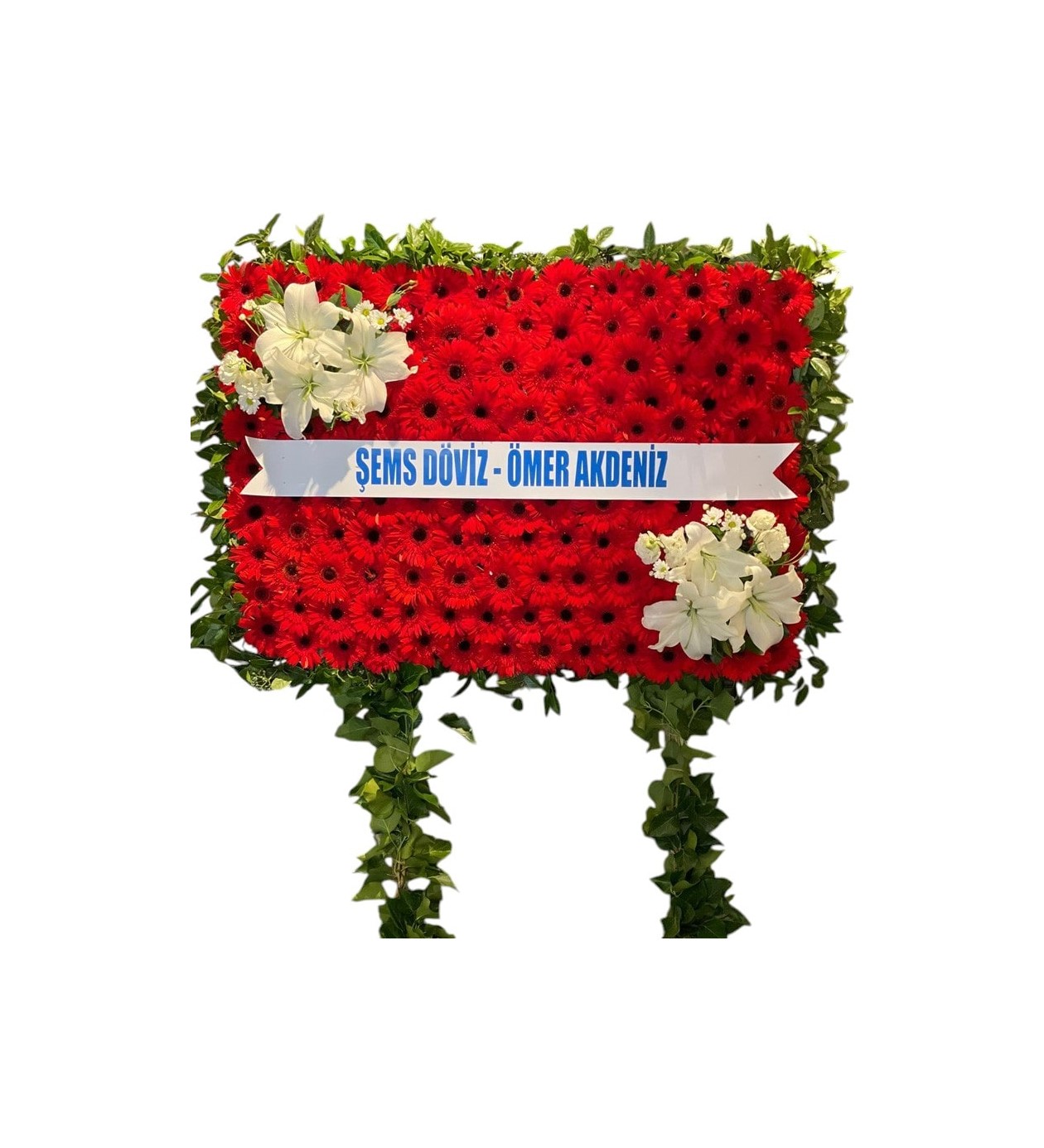 Bant Yazısı: Panonun tam ortasından geçen beyaz saten kurdele/bant üzerinde gönderenlerin isimleri yer almaktadır: "ŞEMS DÖVİZ - ÖMER AKDENİZ".