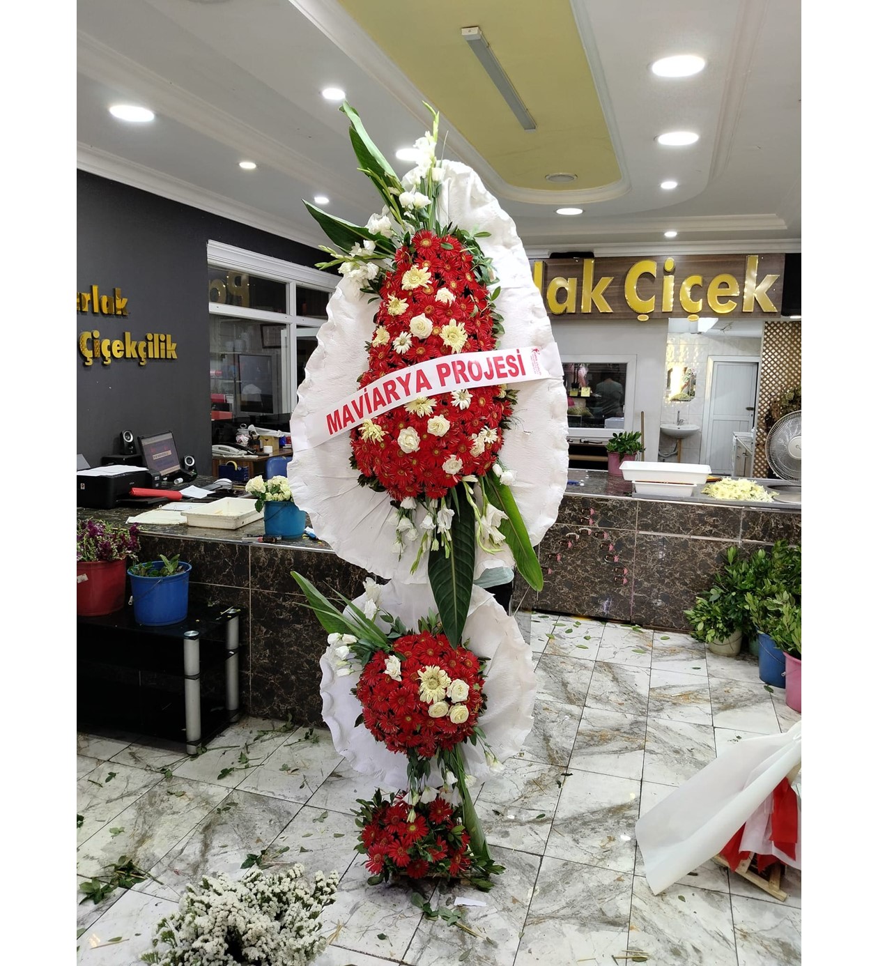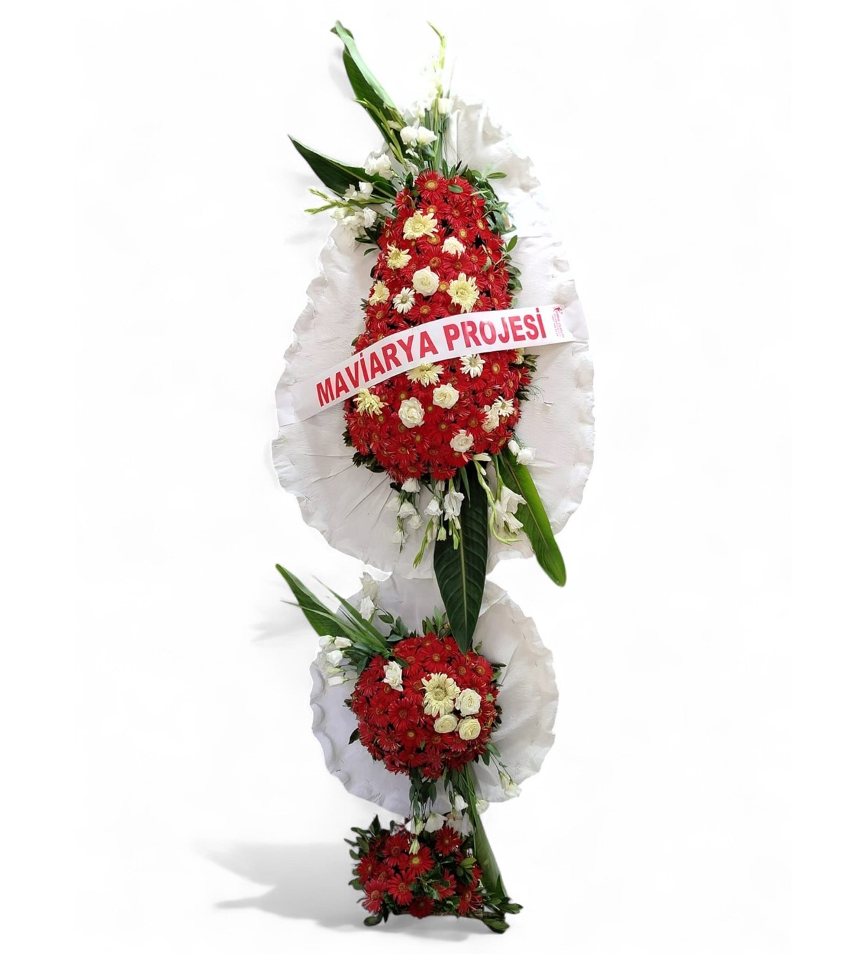 Kırmızı ve Beyaz Kontrastı: Ana dolgu, coşkuyu simgeleyen kırmızı gerbera ve saflığı temsil eden beyaz krizantem/papatya çiçeklerinin dengeli bir karışımından oluşur.