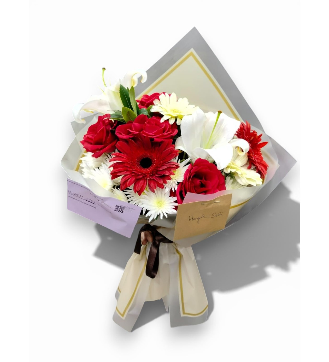 Modern Paketleme: Çiçeklerin renklerini ön plana çıkaran, gri-beyaz tonlarında, desenli ve altın şerit detaylı premium ambalaj tasarımı.