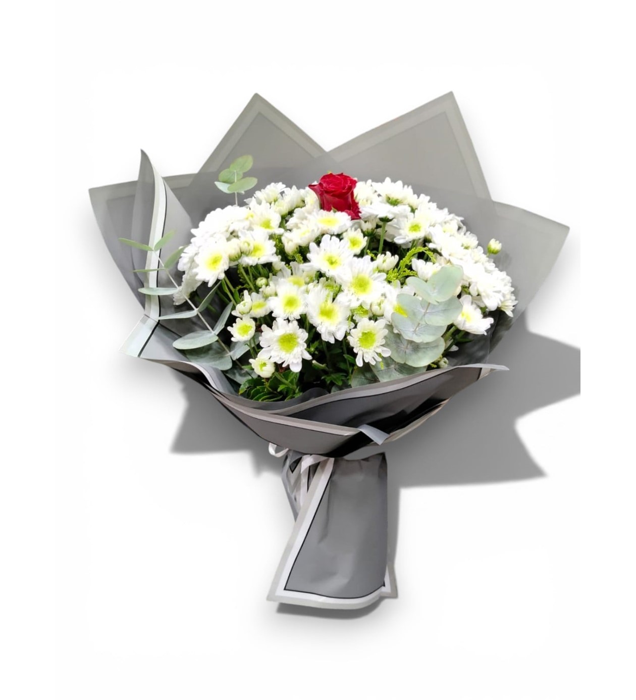 Merkezi Kırmızı Gül: Papatyaların tam ortasında yer alan, aşkın ve benzersizliğin sembolü olan tek bir premium kırmızı gül.
