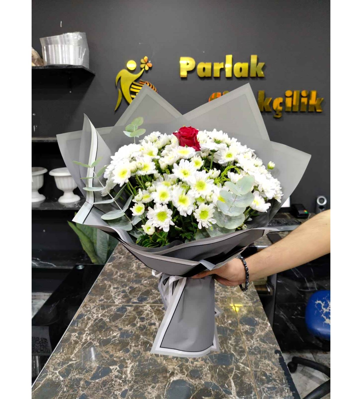 Bu zarif buket, profesyonel paketleme teknikleri ve taze çiçeklerin uyumuyla hazırlanmıştır:
