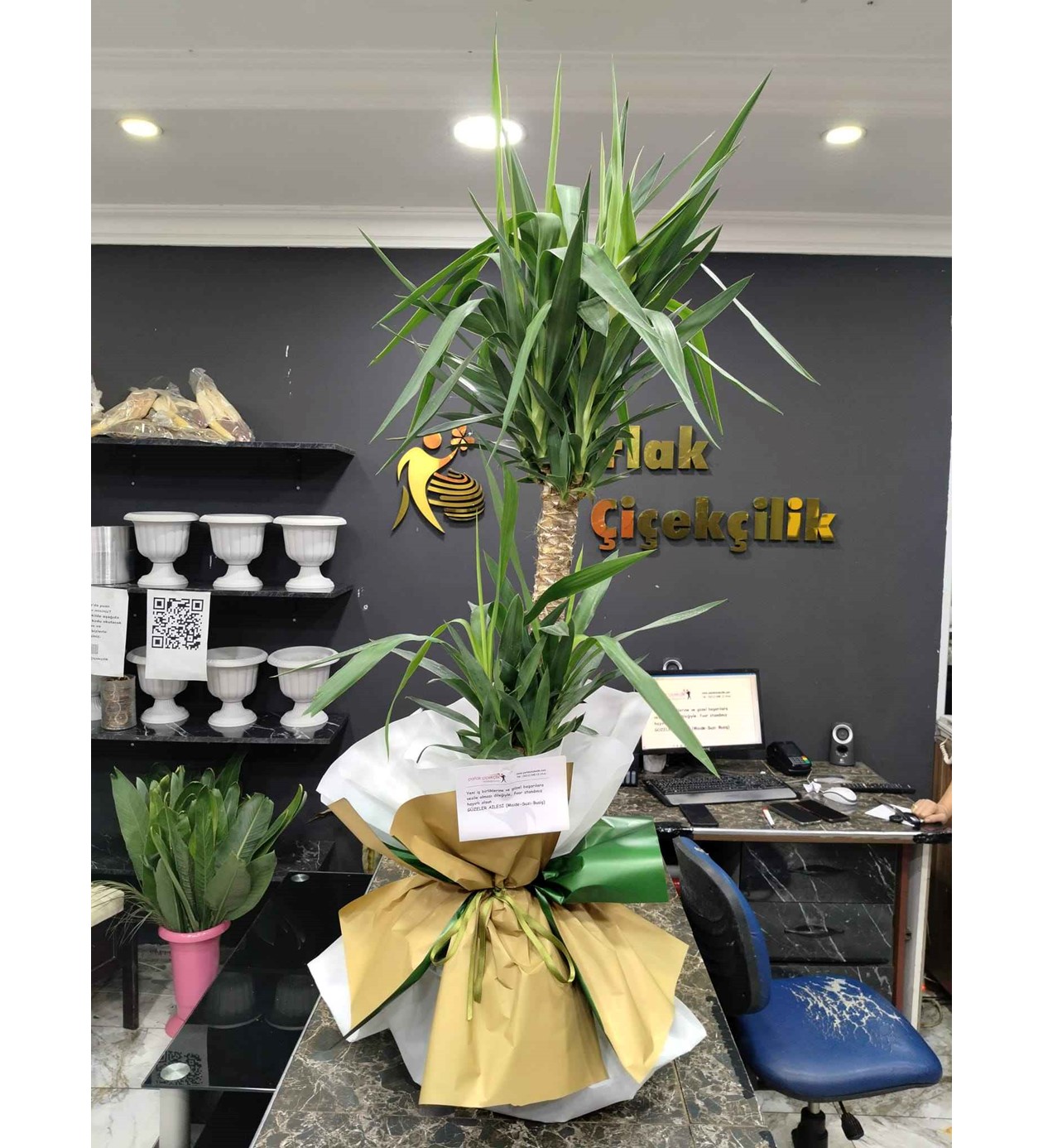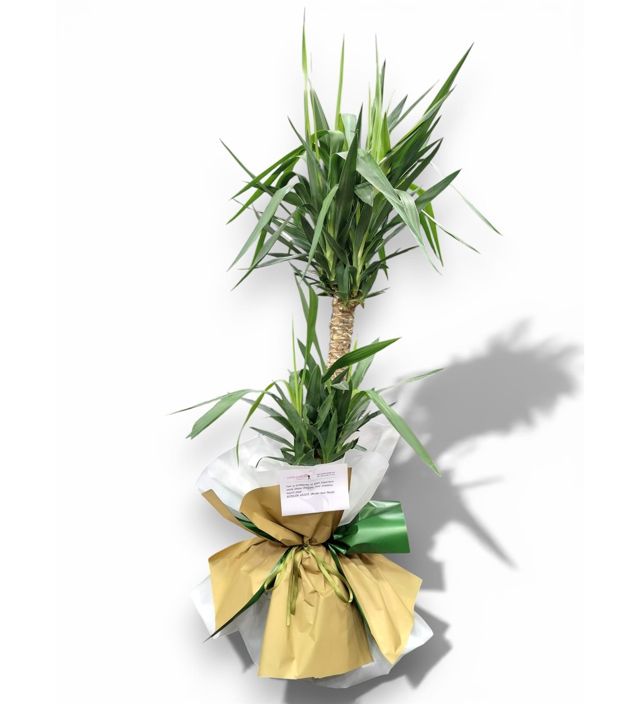 Doğanın gücünü ve estetiğini yaşam alanlarınıza taşıyın! Keskin hatlı yaprakları ve sağlam gövdesiyle dikkat çeken Yucca, hem ev hem de ofis dekorasyonu için en çok tercih edilen, bakımı kolay ve uzun ömürlü bir bitkidir. Şık hediye paketiyle sunulan bu aranjman, yeni iş tebriği veya yeni ev hediyesi için mükemmel bir prestij seçeneğidir.