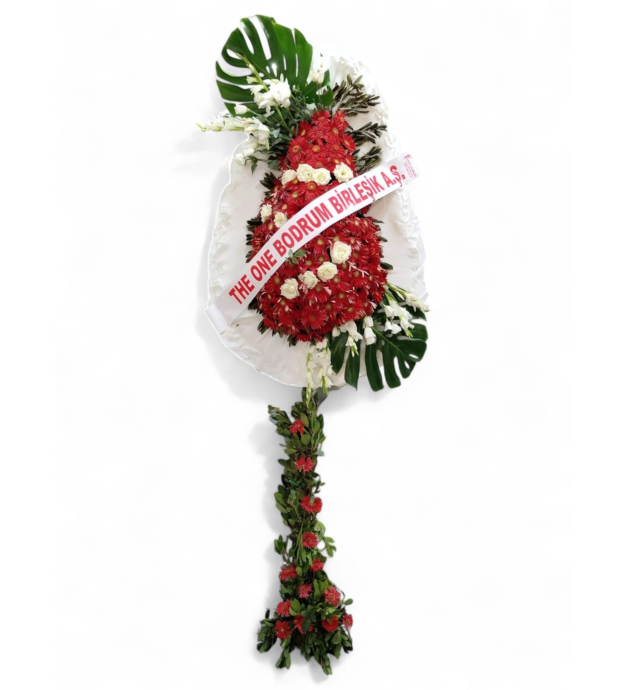 Yeni bir başlangıcın coşkusunu, düğün sevincini veya kurumsal bir başarının gururunu modern ve göz alıcı bir stille kutlayın! Bu tropikal yapraklarla desteklenmiş dikey çelenk, klasik tasarımlardan sıyrılarak prestijli ve unutulmaz bir tebrik mesajı sunar.