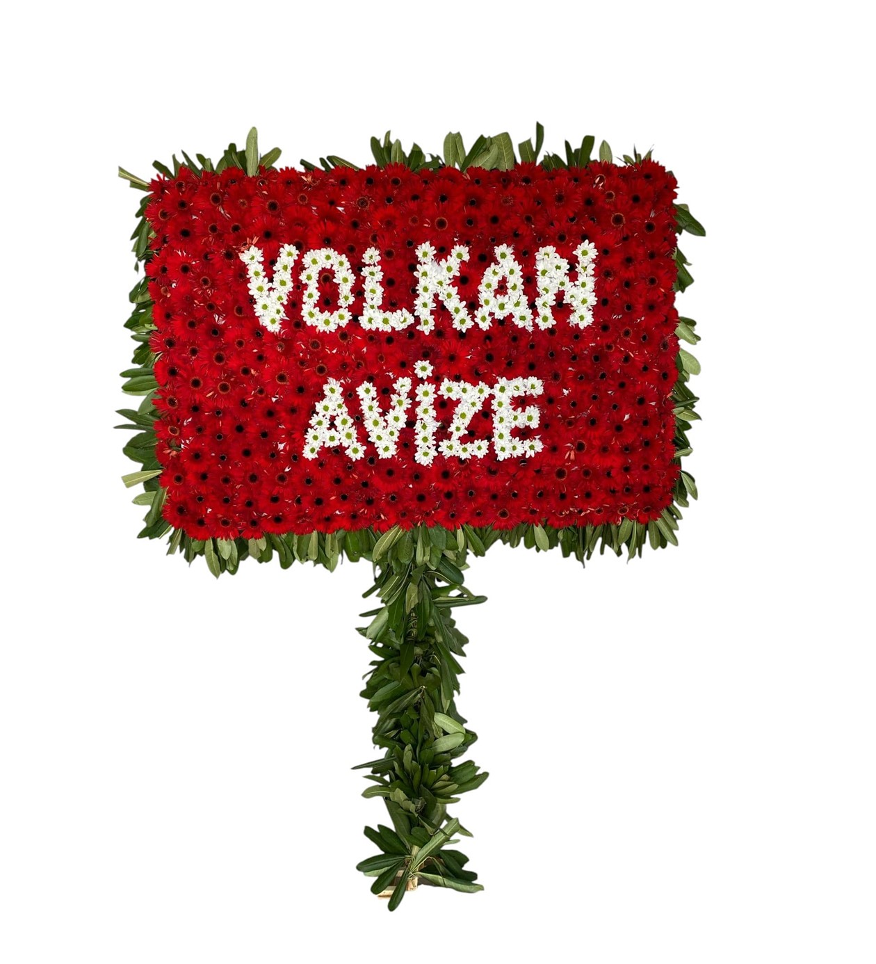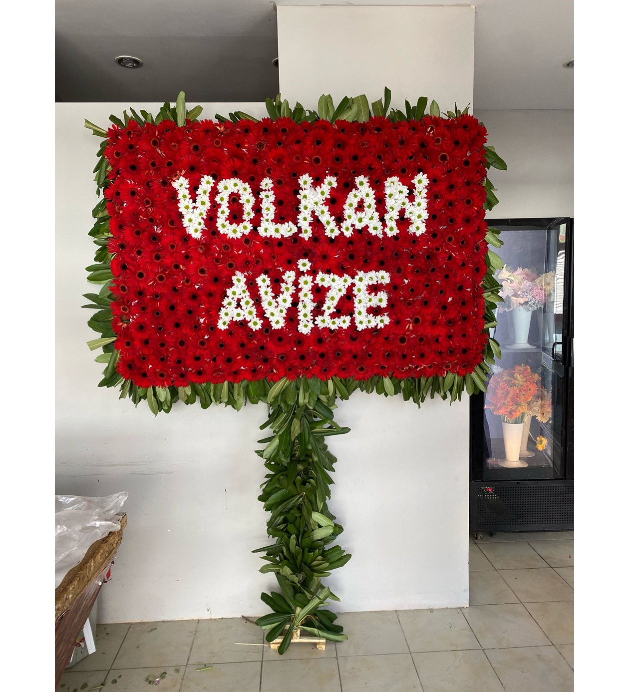 Görüntüdeki çiçek aranjmanı, önceki örneklere benzeyen, işletme/kişi adı yazılı bir pano çelenk modelidir.