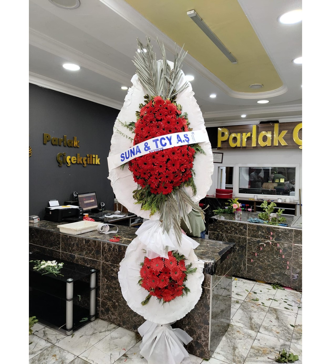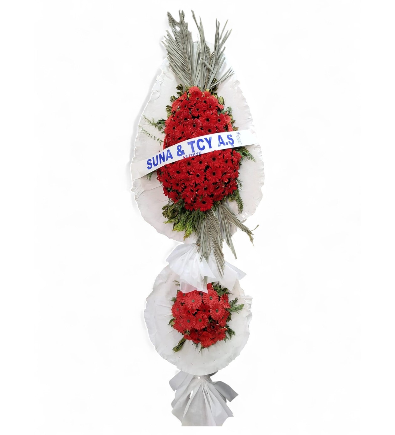 Kırmızı Odak: Her iki katmanın merkezinde yoğun kırmızı gerbera kullanılmıştır; bu, tutkuyu ve coşkuyu simgeler.
