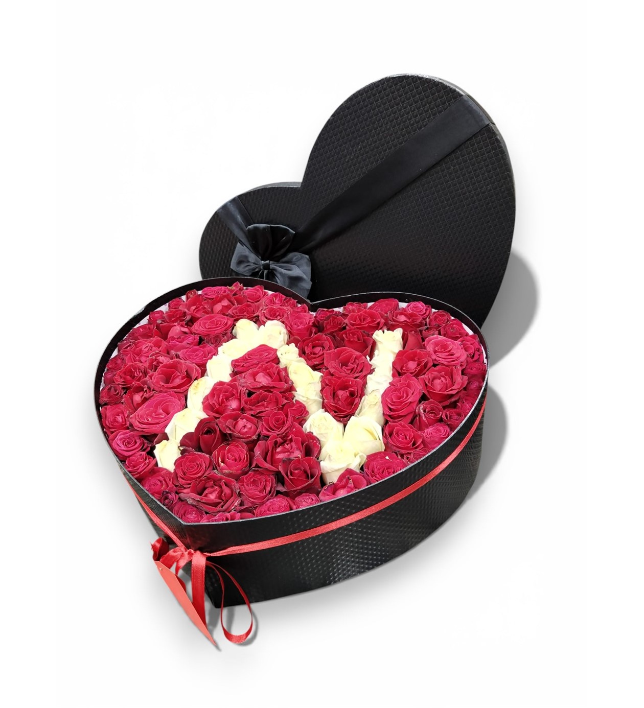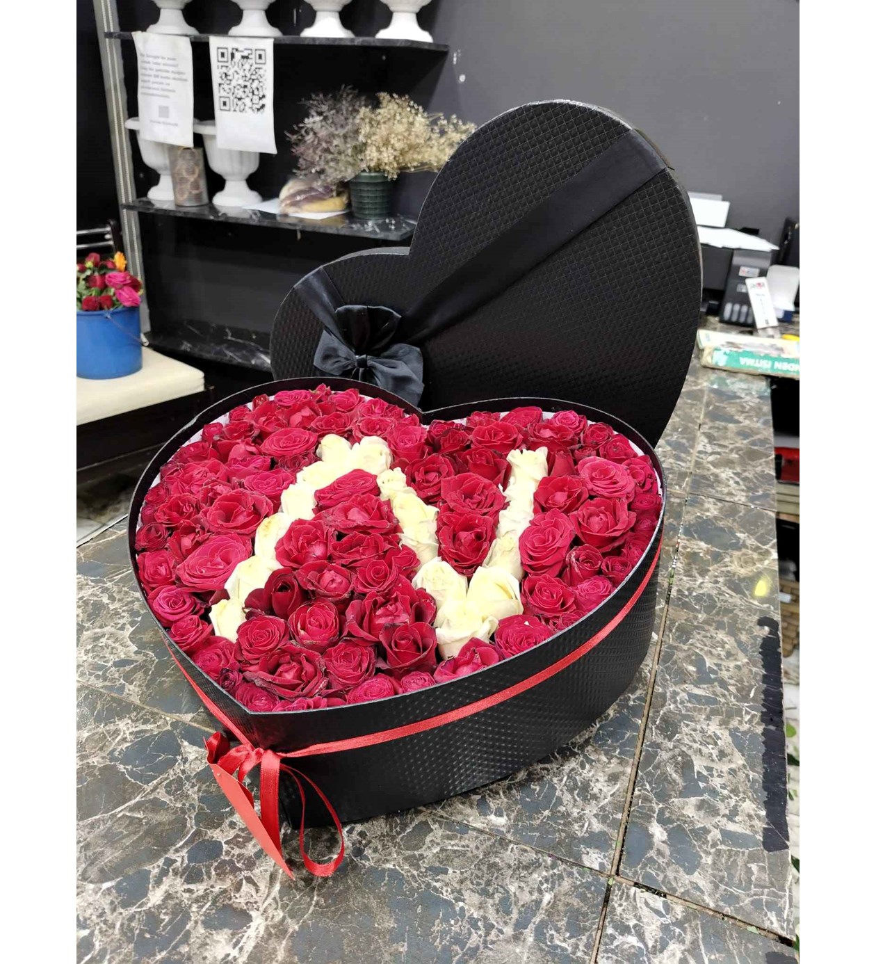 Duygularınızı ona özel bir sembolle mühürleyin! Siyah lüks kalp kutu içerisinde, taptaze kırmızı güllerin arasına beyaz güllerle nakşedilen baş harf detayı, sevginizin benzersizliğini ifade eder. Hem modern hem de son derece asil bir duruş sergileyen bu aranjman, kalpten gelen en şık mesajdır.