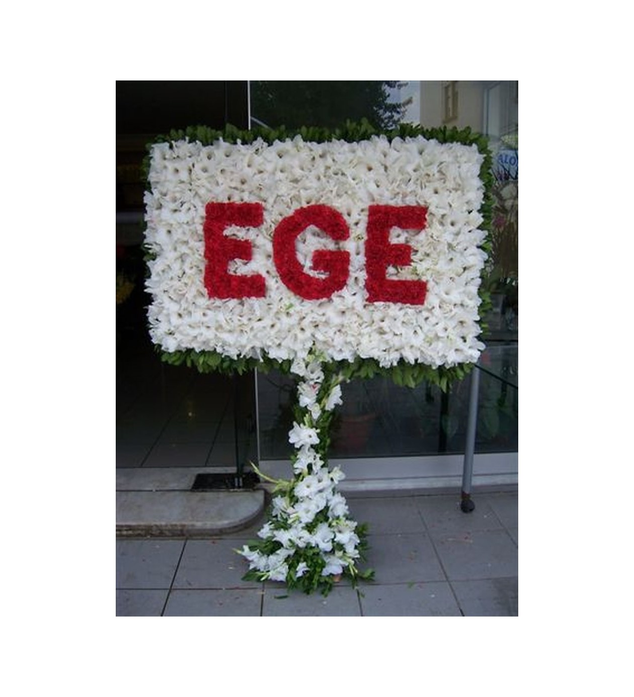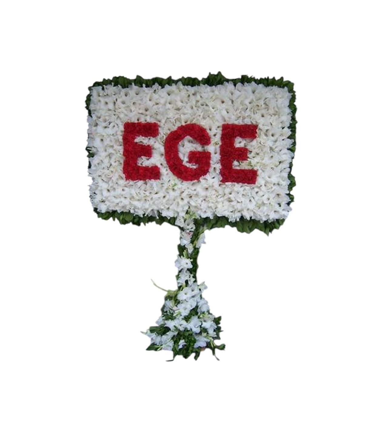 Yazı: Kırmızı çiçeklerle yazılan kelime "EGE" şeklindedir.
