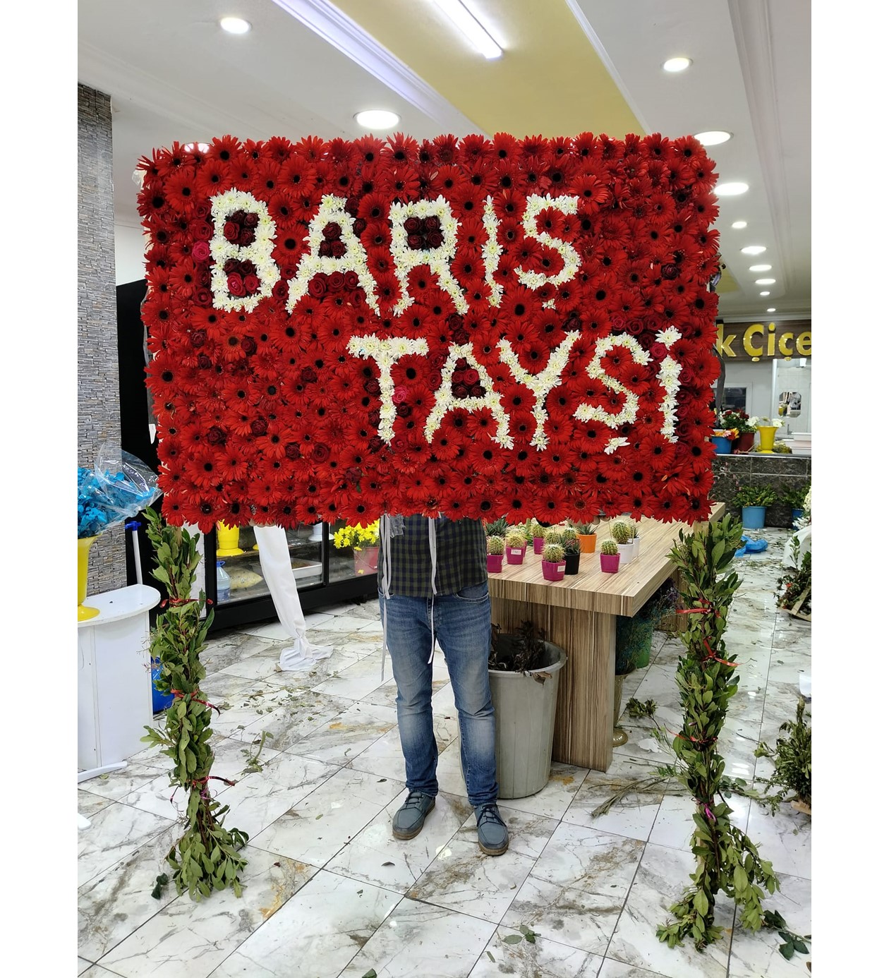 Yazı: Beyaz çiçeklerle yazılan isim "BARIŞ TAYSI" şeklindedir.