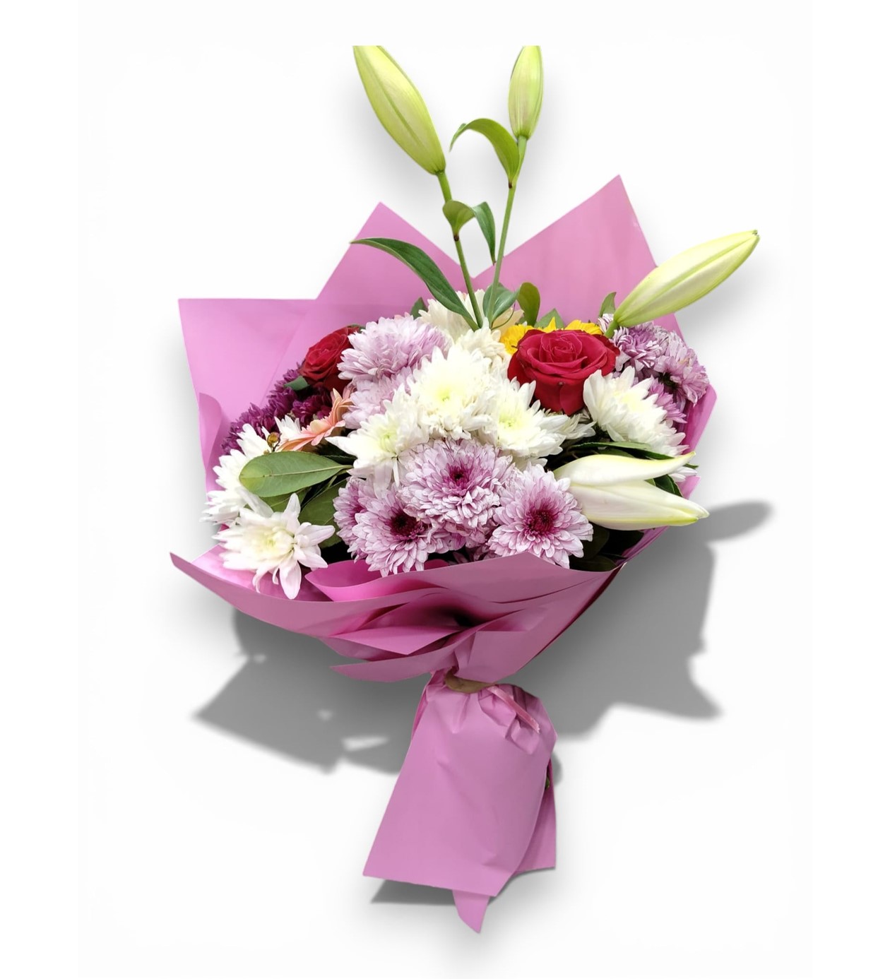 Duygularınızı en saf ve en canlı şekilde ifade edin! Mis kokulu beyaz lilyumların (zambak) asaletini, pembe ve mor krizantemlerin enerjisiyle harmanladık. Şık fuşya ambalajıyla sunulan bu özel mevsim buketi, doğanın tüm güzelliğini tek bir tasarımda birleştirerek özel günlerinizi taçlandırmak için hazırlandı.