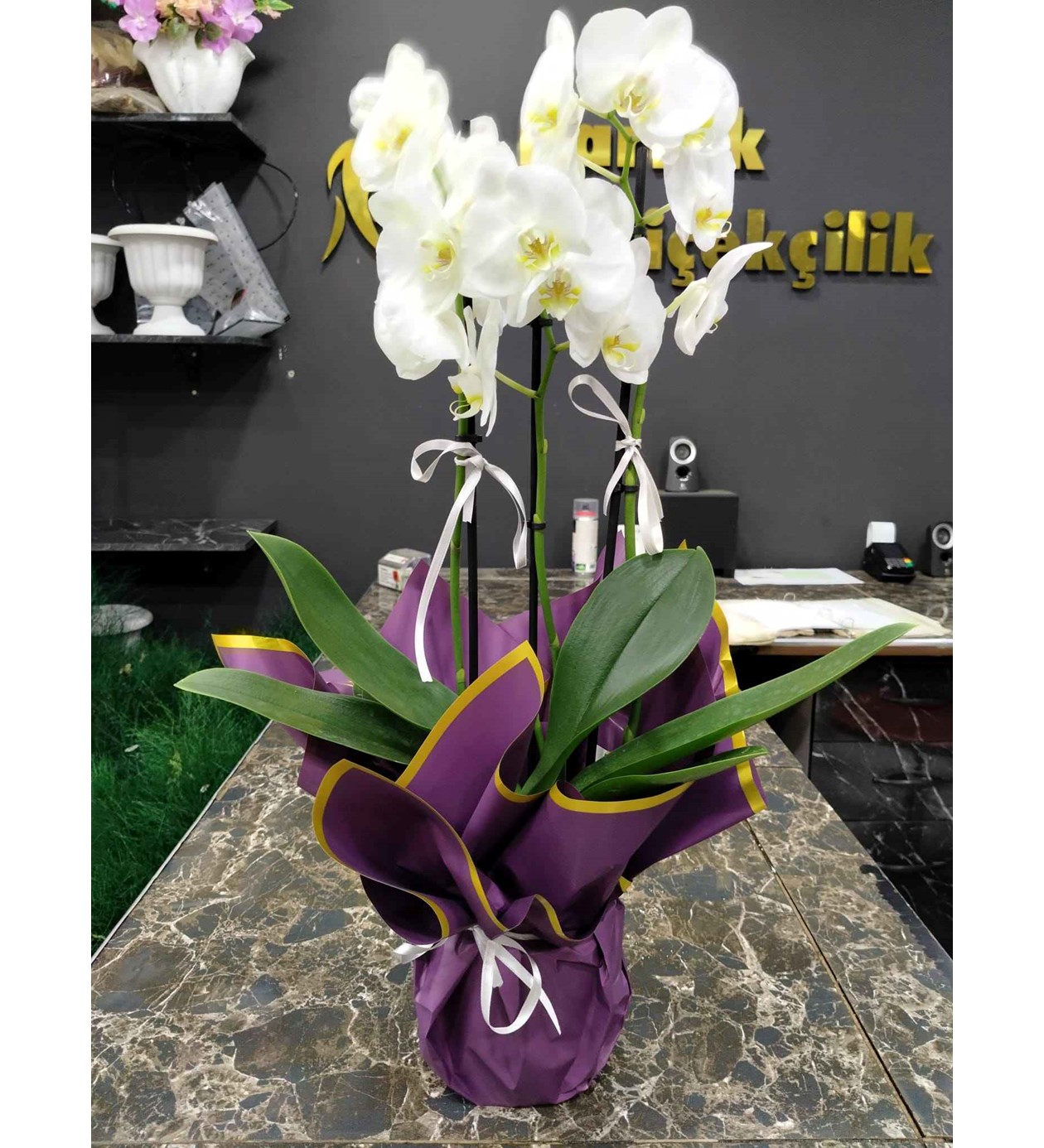 Lüks Paketleme: Orkidelerin beyazlığını vurgulayan, altın (gold) şeritli mat mor premium ambalaj kağıdı.