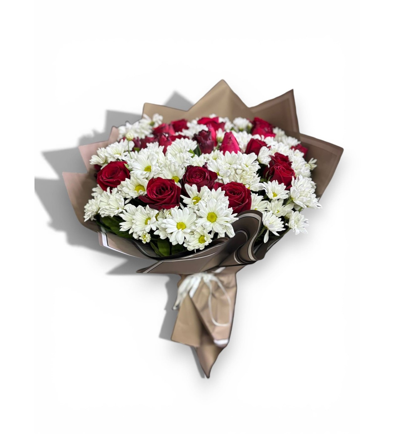 Duygularınızı en saf ve en tutkulu haliyle sunun! Büyük boy papatya ve kırmızı gül buketi, taze beyaz papatyaların (krizantem) ferahlığını, birinci sınıf kırmızı güllerin asil duruşuyla buluşturuyor. Modern kahve ve vizon tonlarındaki premium ambalajı ile zenginleştirilen bu aranjman, ulaştığı her yere bahar tazeliği ve romantizm taşır.