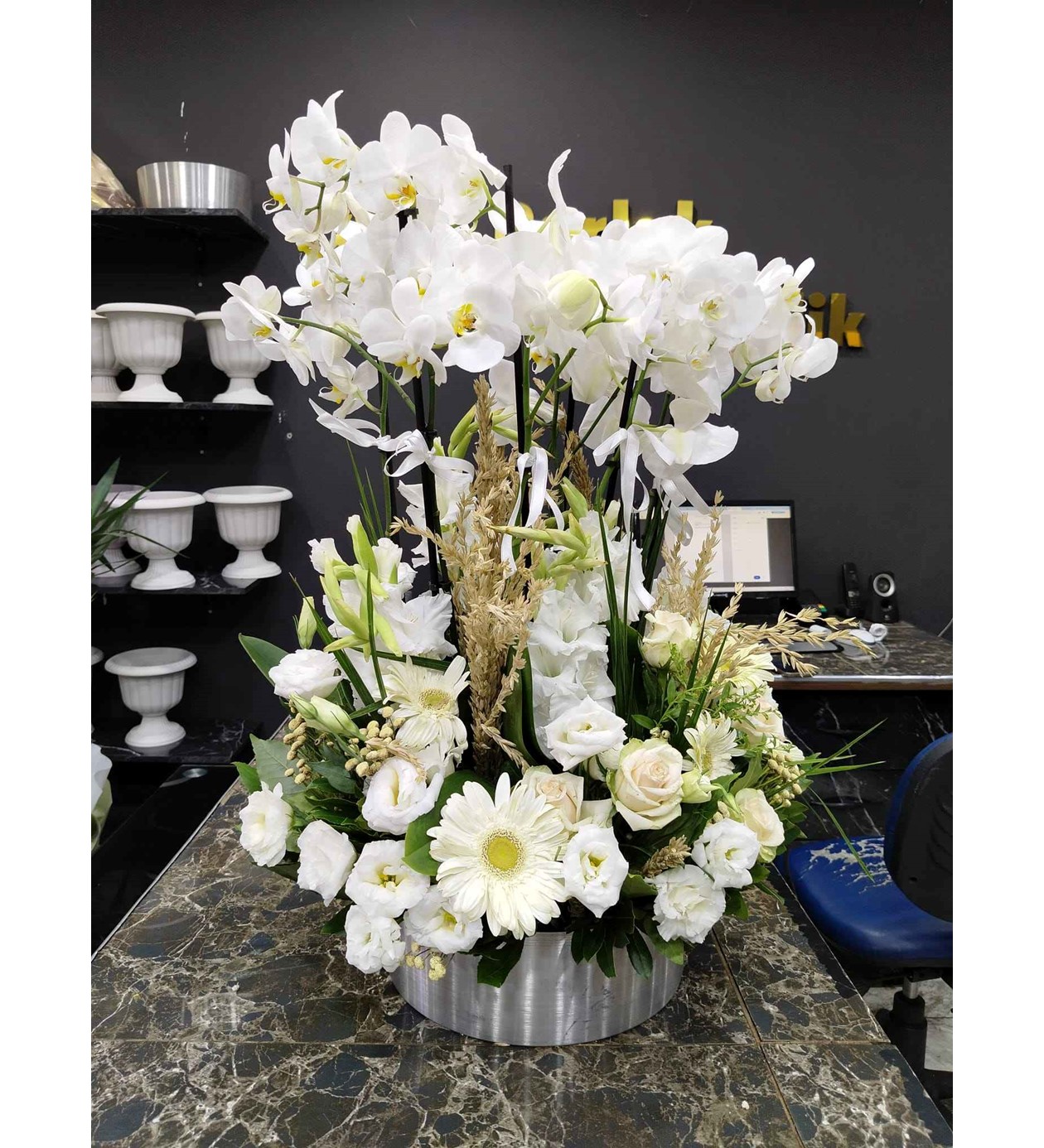 Beyaz orkidelerin asaleti; lisyantus, gerbera ve doğal kuru başak dokunuşlarıyla desteklenerek dengeli ve göz alıcı bir kompozisyon elde edilmiştir. Ofis, ev, otel, plaza ve özel davet alanlarında şıklığı tamamlayan bu aranjman; yeni iş, tebrik, geçmiş olsun, teşekkür veya özel gün hediyesi olarak güvenle tercih edilebilir.