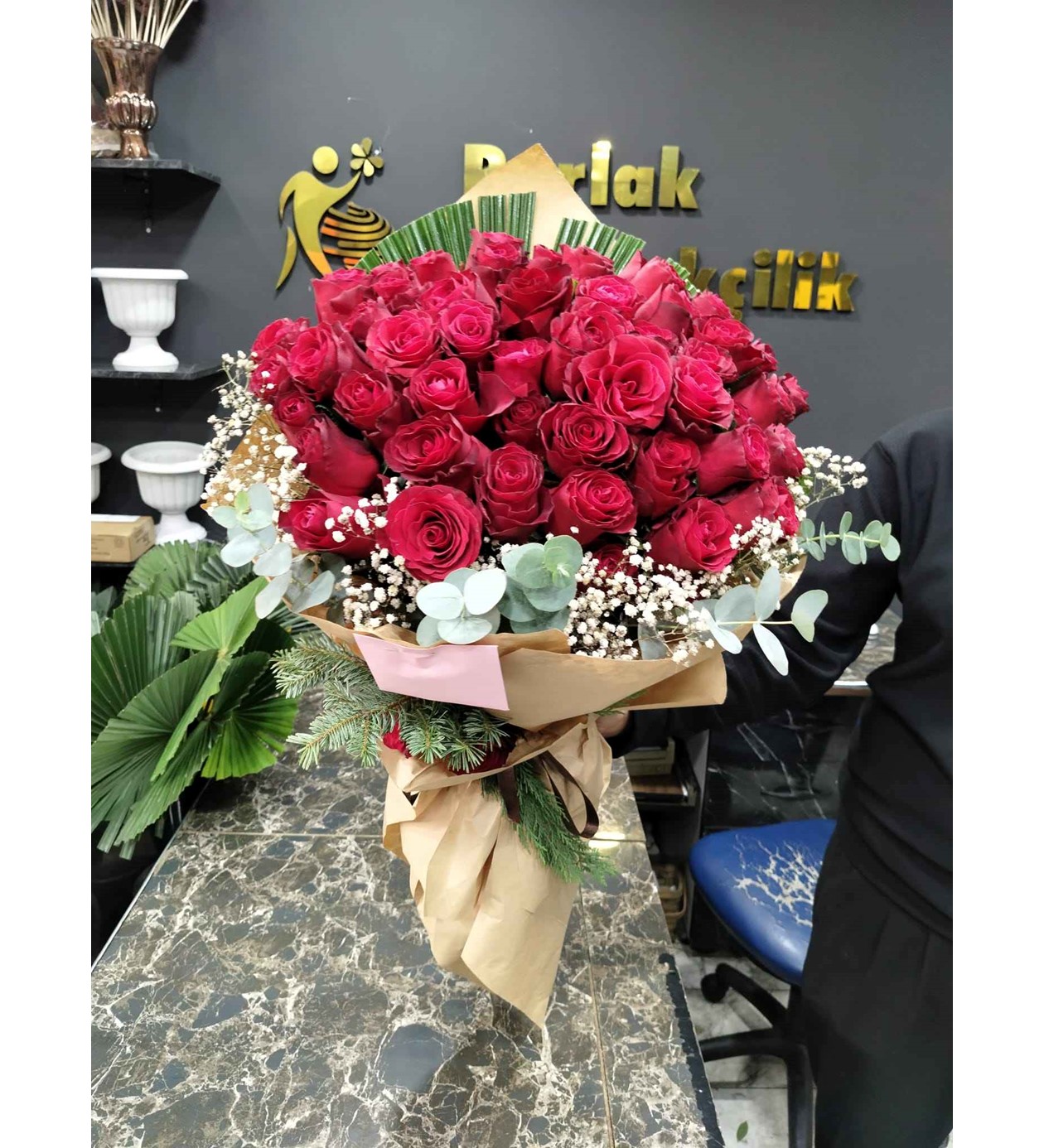 Modern Tasarım: Klasik gül buketlerini okaliptüsün modern dokunuşuyla yeniden yorumlayan trend bir aranjmandır.
