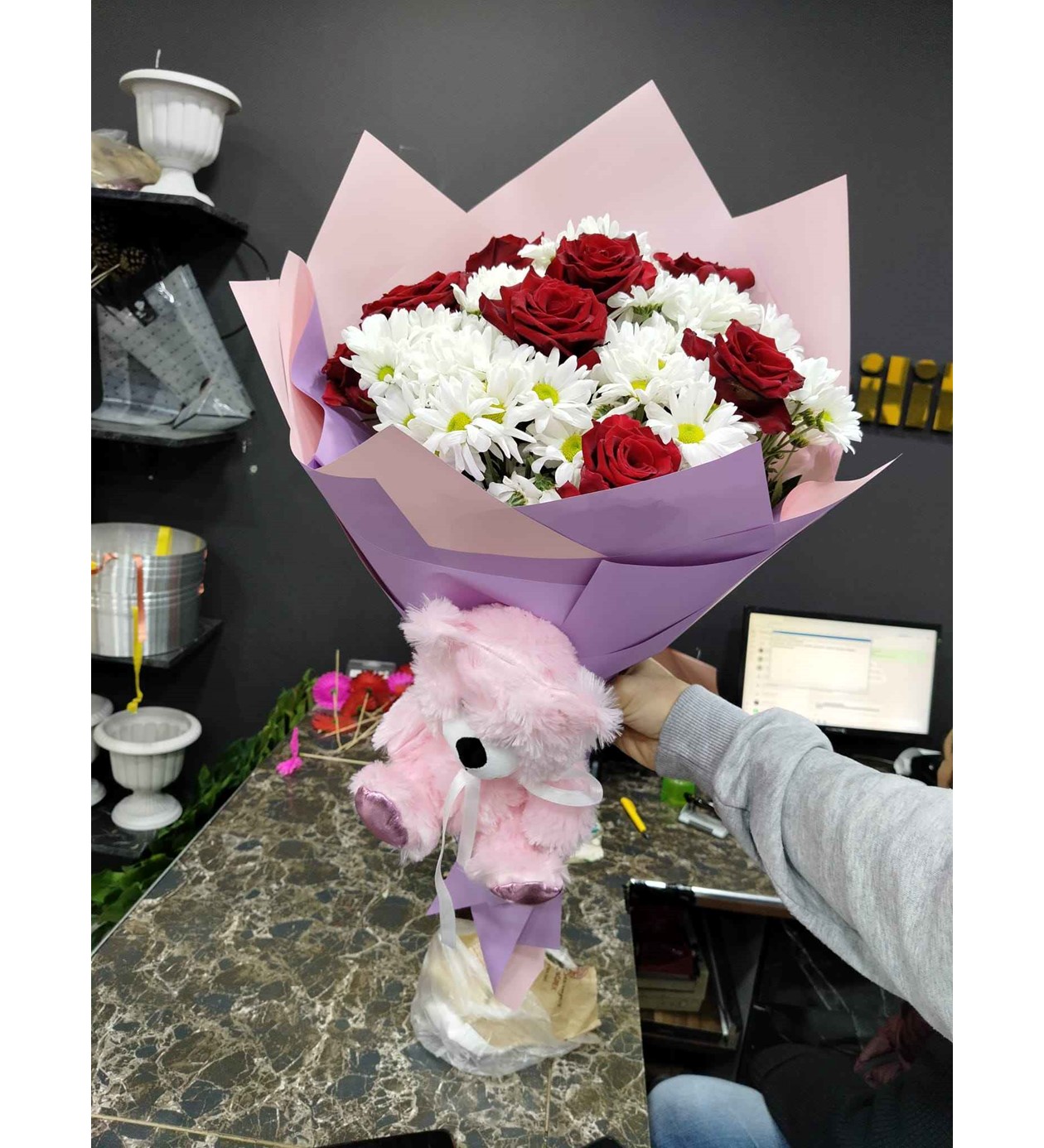 Modern Paketleme: Çiçeklerin renklerini ön plana çıkaran, gri tonlarda ahşap dokulu estetik dış ambalaj.