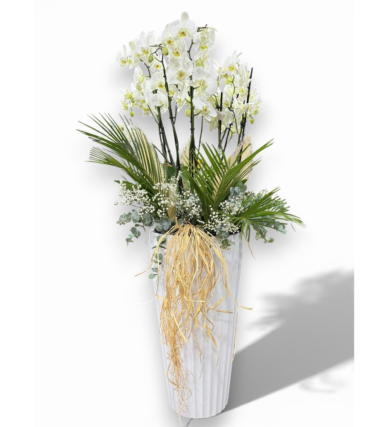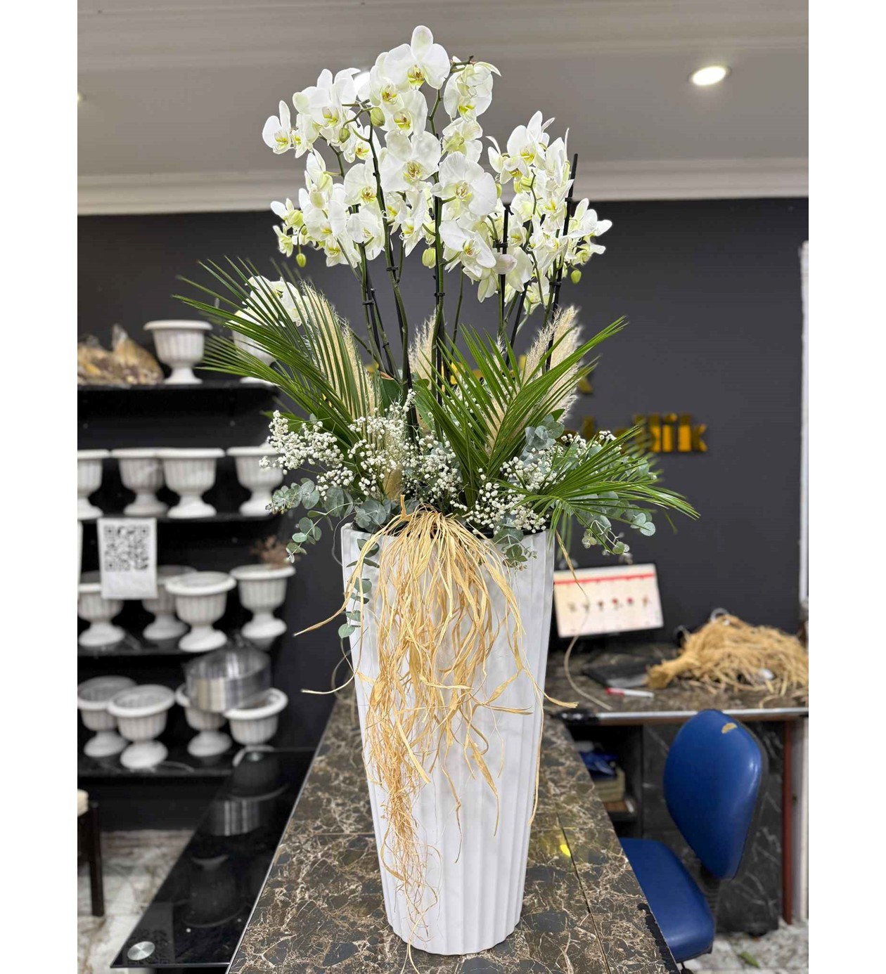 Zarafeti yeniden tanımlayan, mekanın enerjisini anında değiştiren bir sanat eseri! Bu premium orkide aranjmanı, saflığın simgesi olan dört dallı beyaz Phalaenopsis orkideleri, modern ve uzun bir vazoda, egzotik yeşilliklerle bir araya getiriyor. Hem bir dekorasyon objesi hem de en özel anların unutulmaz hediyesi olarak tasarlandı.