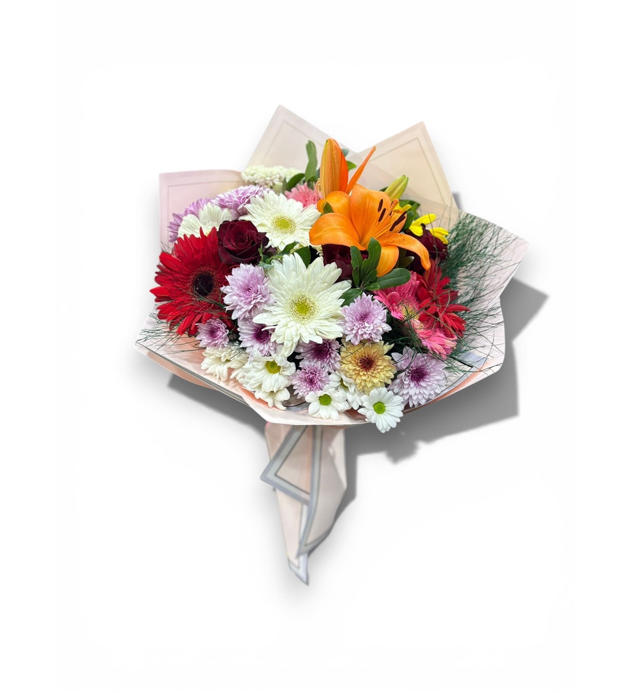 Zarafetin en canlı haliyle tanışın! Buketin odak noktasında yer alan görkemli turuncu lilyumlar, tazeliği simgeleyen beyaz gerberalar ve romantik kırmızı güllerle birleşerek görsel bir şölen oluşturuyor. Pembe ve beyaz krizantemlerin soft dokunuşuyla dengelenen bu aranjman, sevdiklerinize en samimi duygularınızı iletmenin en şık yolu.