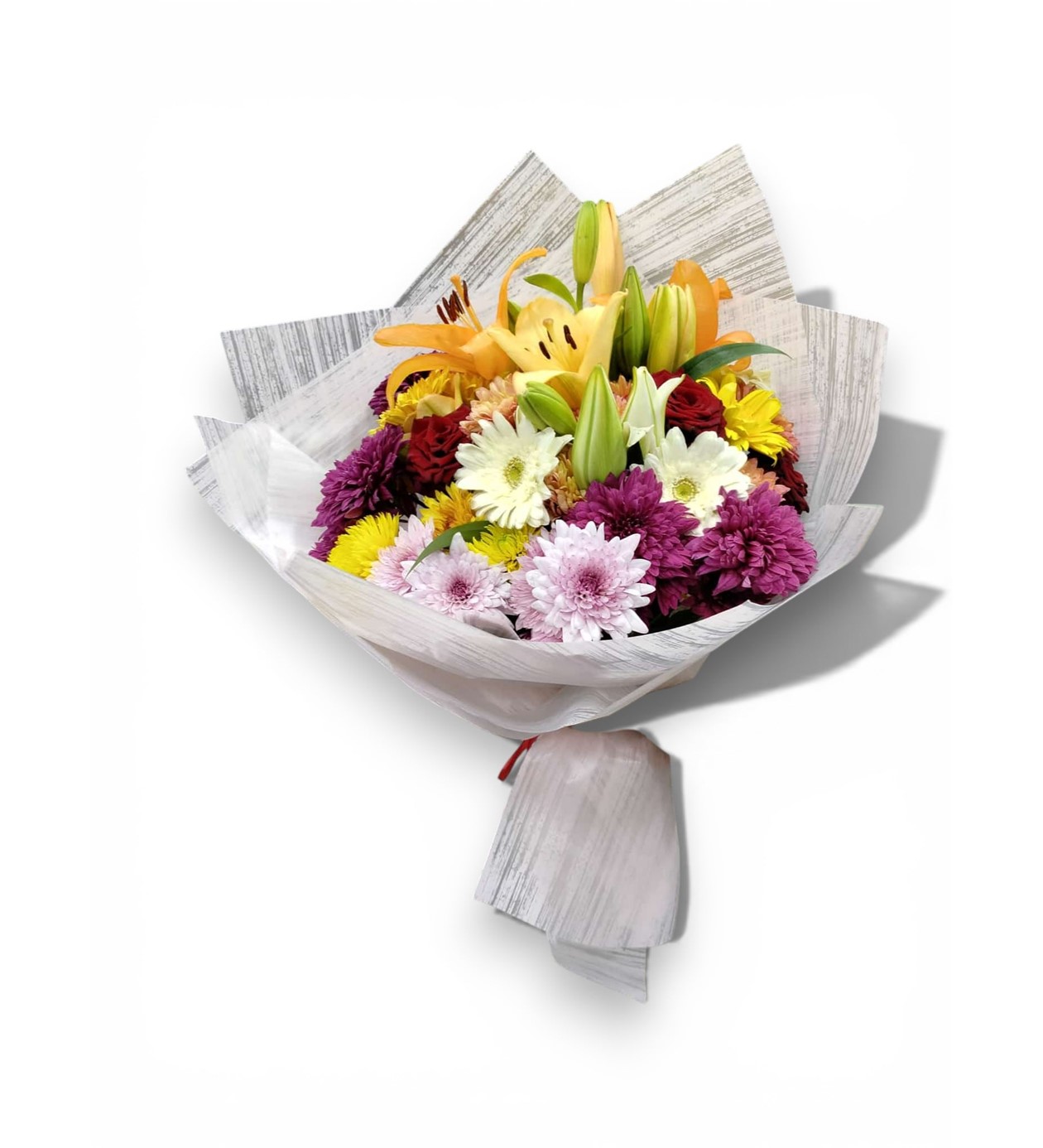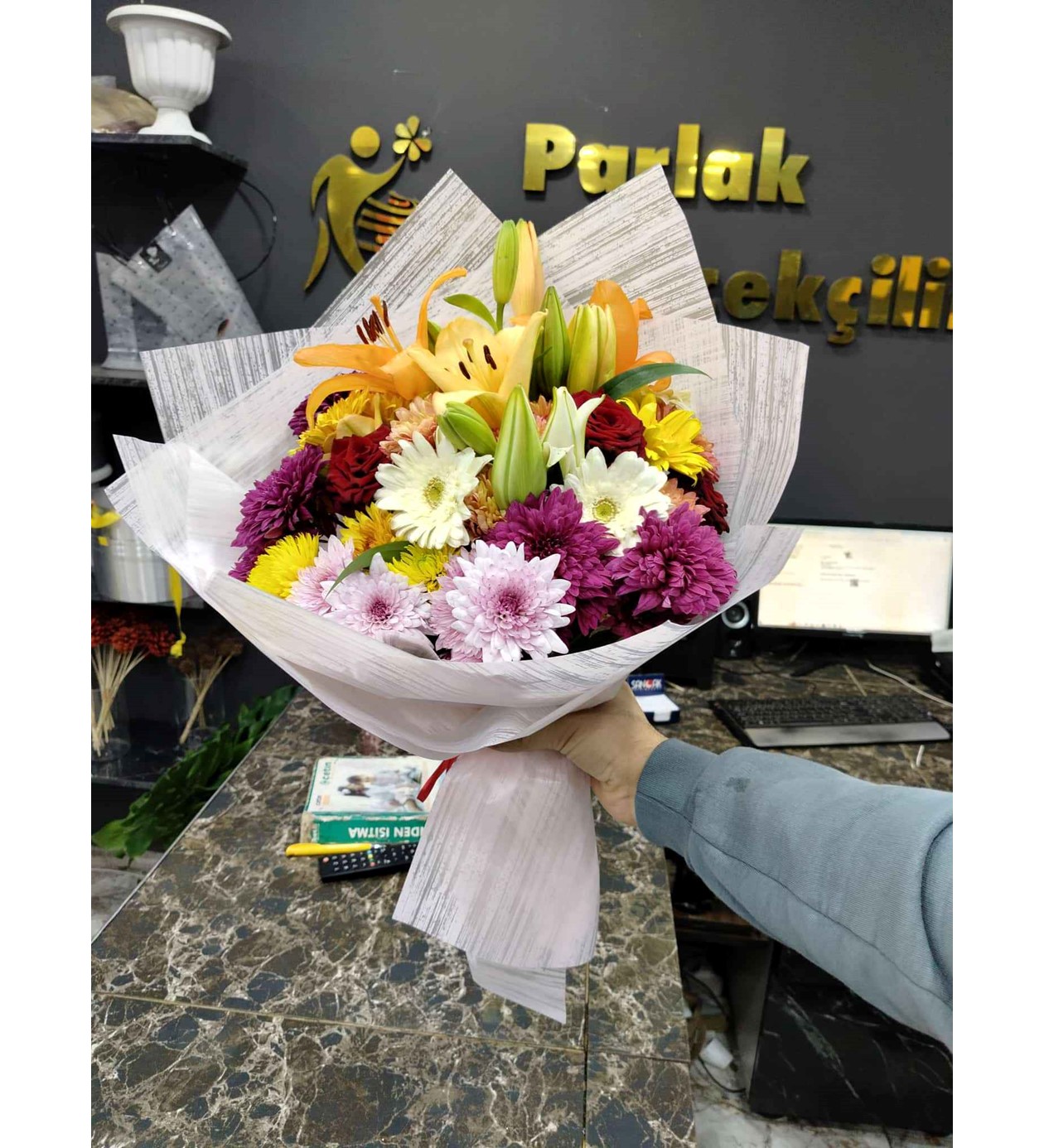 aşam alanlarına enerji, sevdiklerinizin kalbine mutluluk katın! Mevsiminin en seçkin ve taze çiçeklerinin profesyonel bir kompozisyonla bir araya getirildiği bu premium mevsim buketi, zarafeti büyük bir ihtişamla sunuyor. Beyaz lilyumların (zambak) asaletinden canlı sarı ve kırmızı gerberaların enerjisine kadar her detay, unutulmaz bir sürpriz yaratmak için tasarlandı.