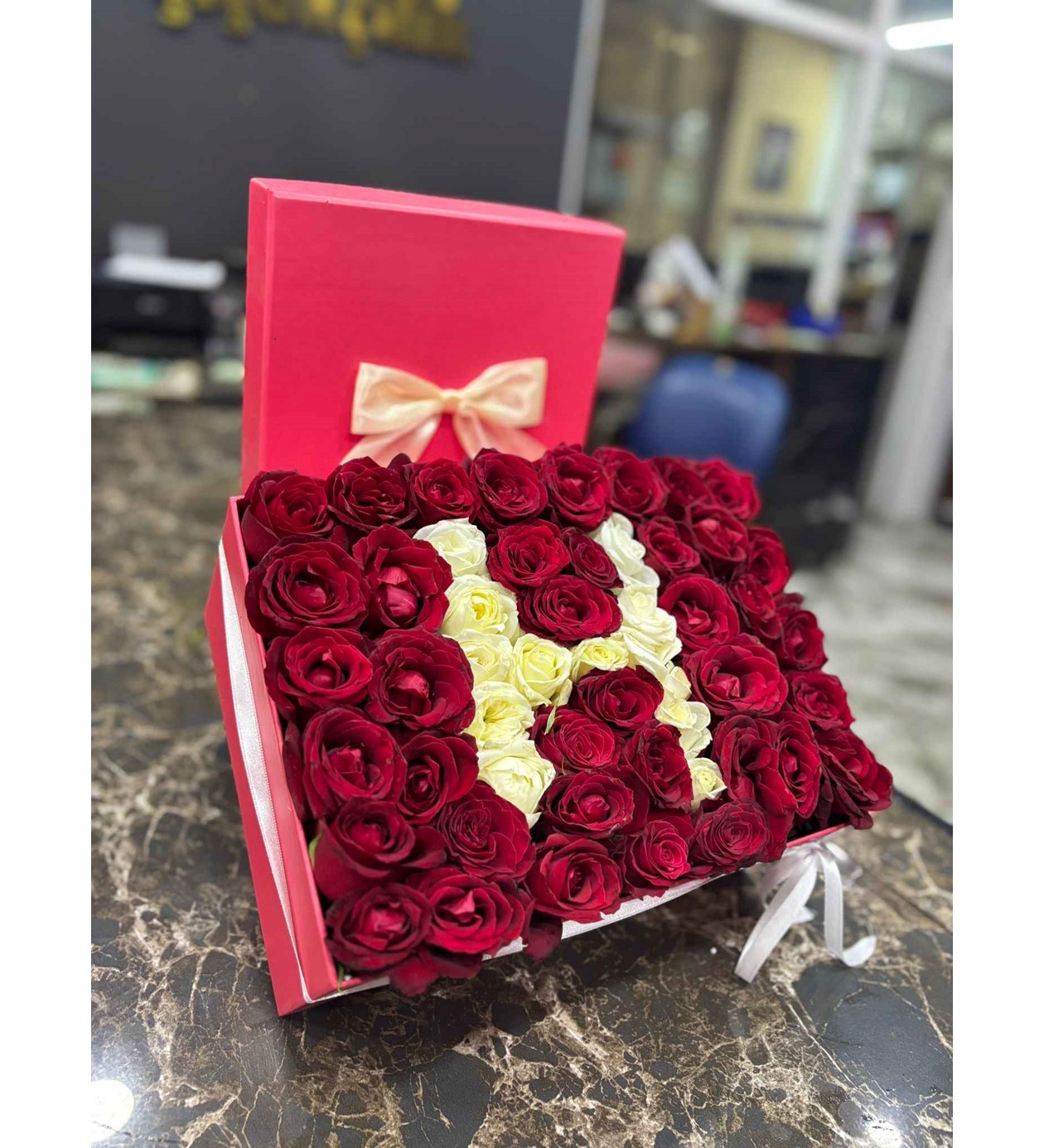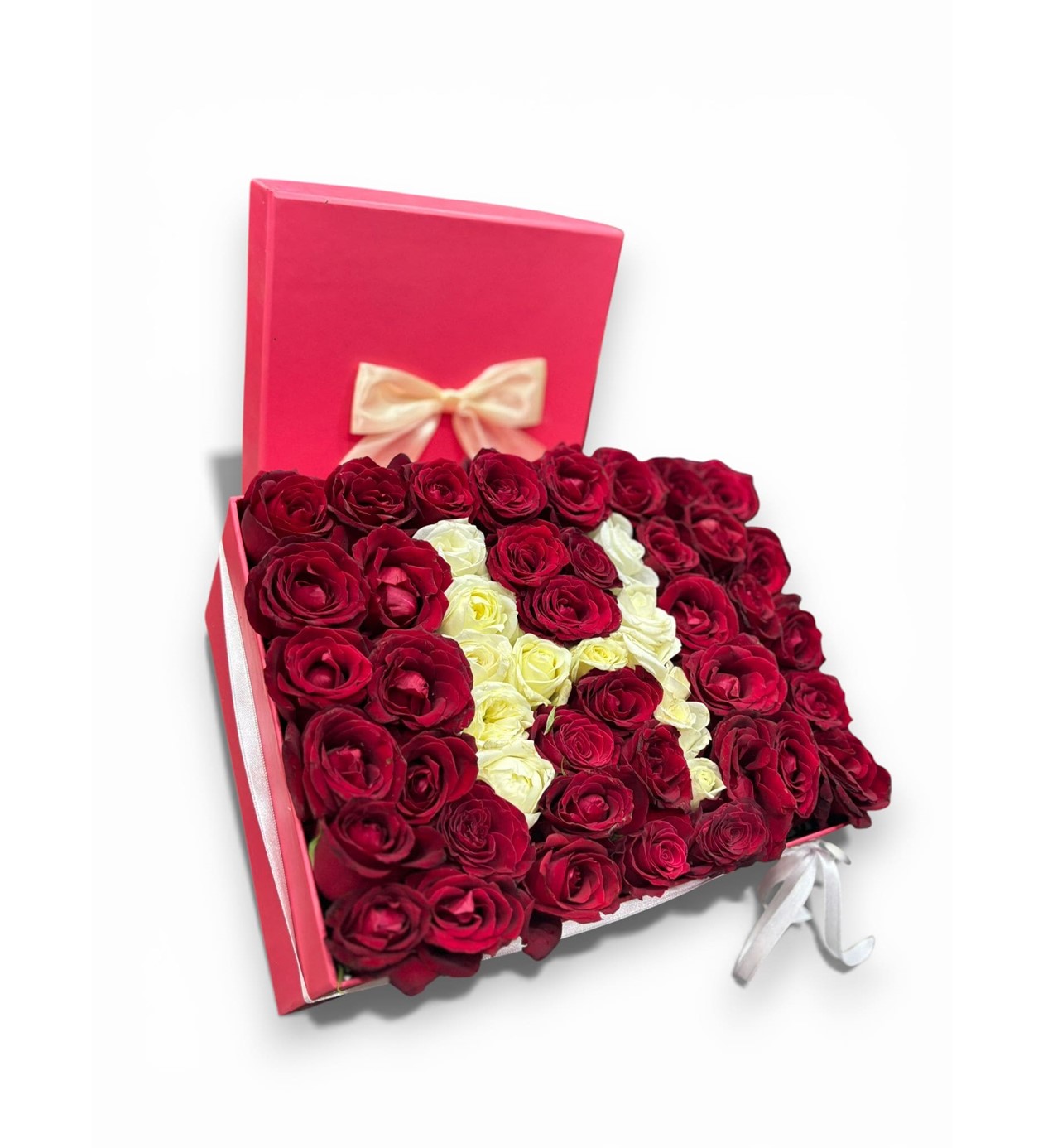 Klasik buketlerin ötesine geçin ve sevdiğinize sadece ona özel olduğunu hissettirin! Yüksek kaliteli kadife dokulu şık bir kutu içerisinde, taze kırmızı güllerle çevrelenmiş beyaz güllerden oluşan kişiye özel baş harf tasarımı, duygularınızı en asil şekilde ifade eder. Doğum günleri, yıldönümleri veya "seni seviyorum" demek istediğiniz her an için bu prestijli tasarım mükemmel bir tercihtir.