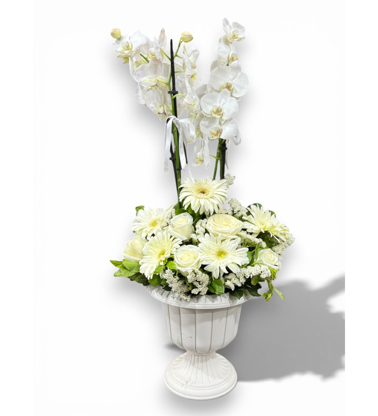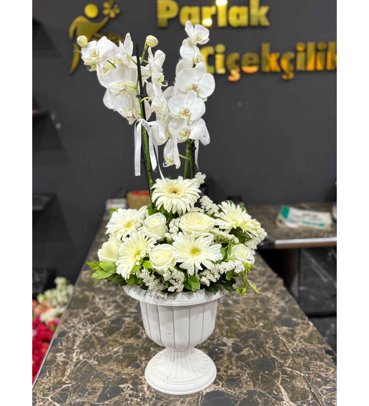Mekanlarınıza asalet, sevdiklerinizin gününe anlam katın! Saf beyazın en şık hali olan bu özel orkide aranjmanı, çift dallı beyaz orkidelerin görkemini, taze beyaz güller ve gerberaların zarafetiyle buluşturuyor. Antik formlu lüks beyaz vazosuyla sunulan bu tasarım, kalıcı bir sanat eseri etkisi yaratarak en özel kutlamalarınızın başrolü olacak.